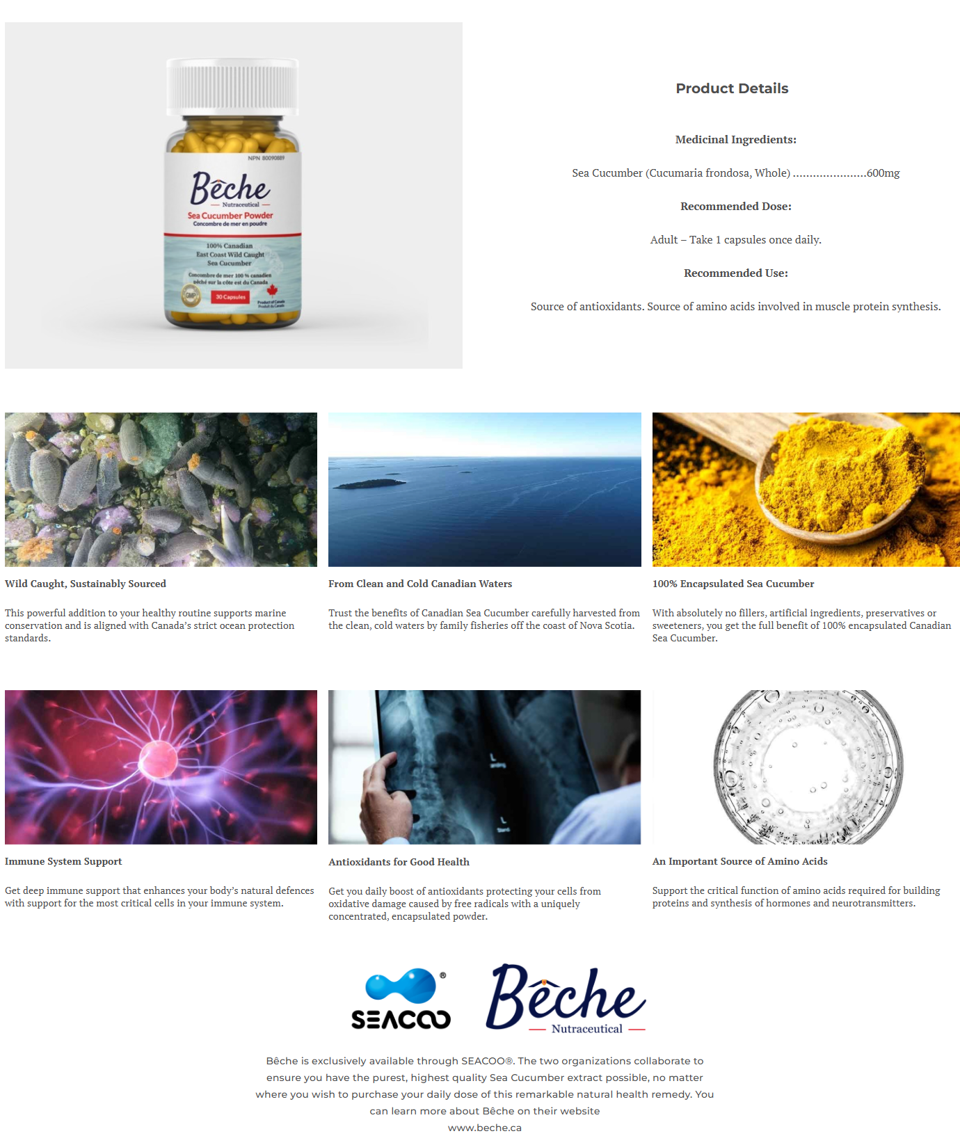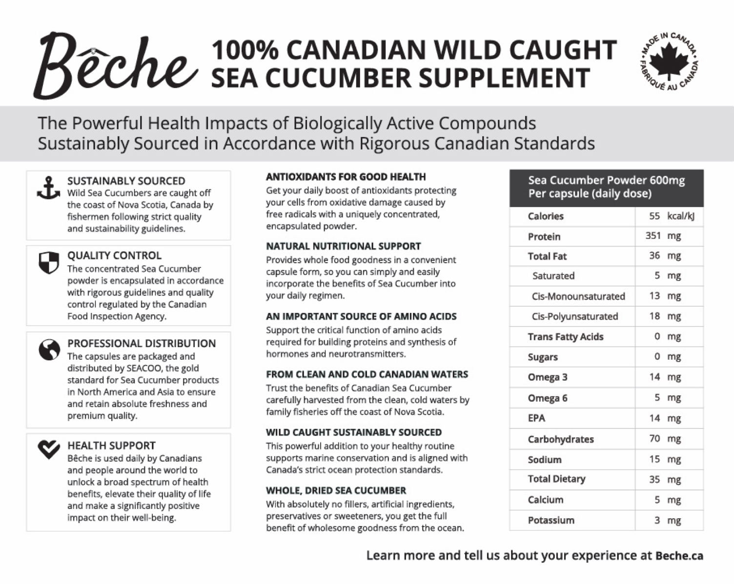 Bêche provides a powerful dose of concentrated Sea Cucumber, which has long been recognized as a natural source of antioxidants and amino acids. Sea Cucumber are rich in valuable and essential nutrients such as vitamin A, B1, B2, B3, magnesium, calcium, zinc, and iron. Each bottle contains thirty(30) 600mg capsules.
